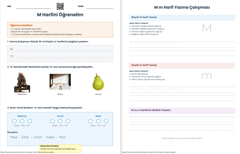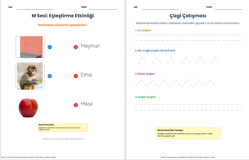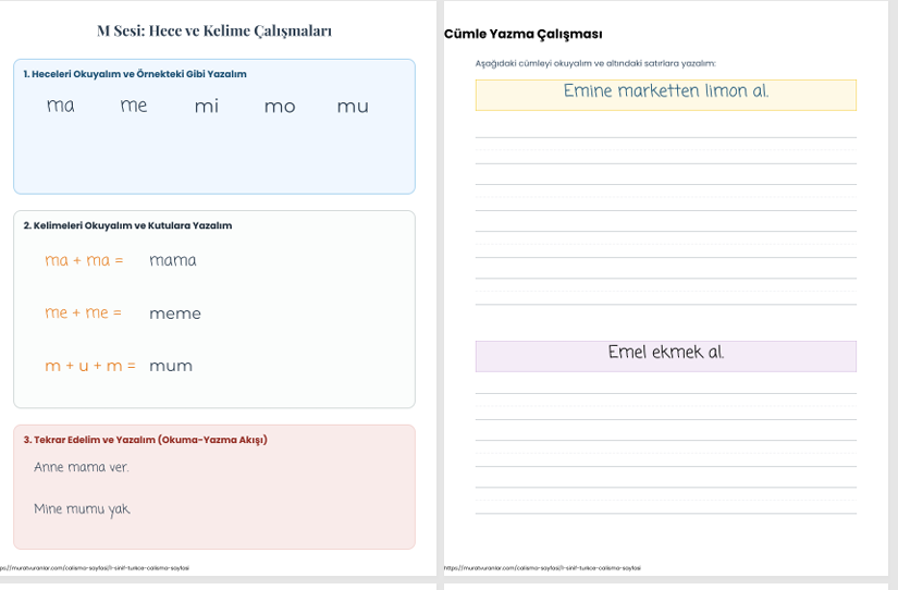 Okuma-yazma yolculuğunun en önemli duraklarından biri olan 'M' sesi için hazırladığımız, tam 16 sayfadan oluşan dev çalışma paketimiz yayında! 1. sınıf öğrencilerinin seviyesine uygun, sade ve eğlenceli bir dille hazırlanan bu fasikülde yok yok:•