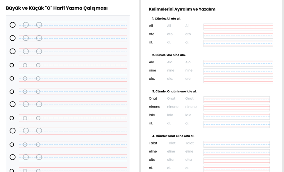 •Harf Yazımı: Büyük "O" ve küçük "o" harflerinin kılavuz çizgiler üzerinde, önce üzerinden geçerek sonra bağımsız şekilde yazılması.