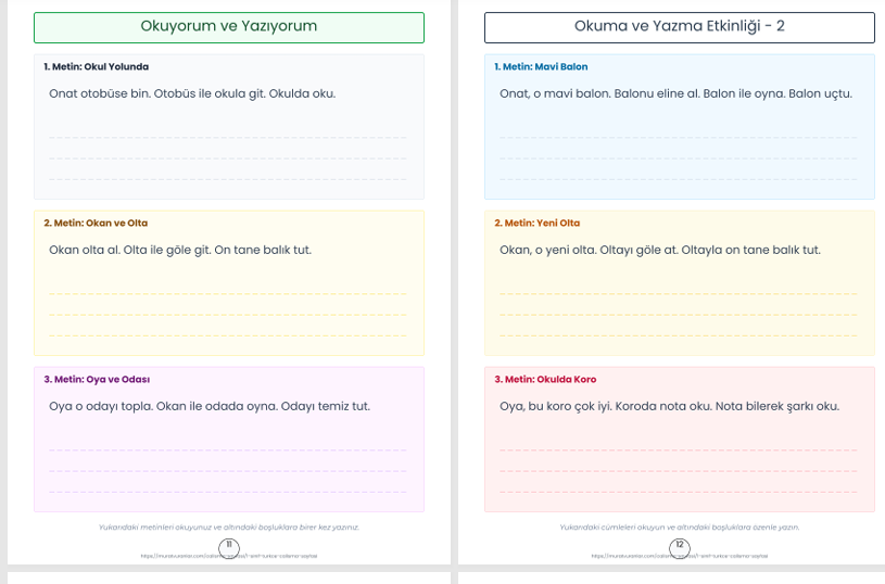 •Okuma Metinleri: "Okul Yolunda", "Okan ve Olta", "Oya ve Odası" gibi kısa ve seviyeye uygun okuma parçaları.