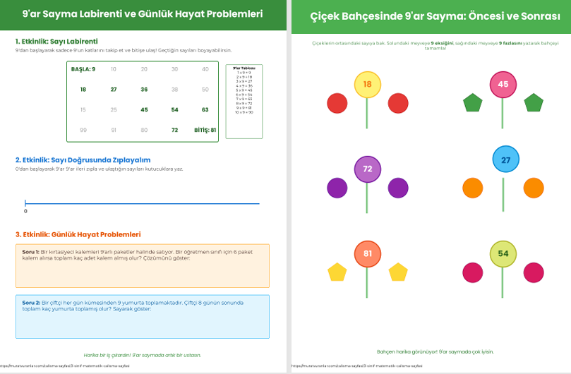 * Çiçek Bahçesi ve Komşu Sayılar: Belirlenen bir sayının 9 öncesini ve 9 sonrasını bulma (+9 / -9 çalışmaları).