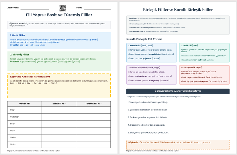 •1. Bölüm: Basit ve Türemiş Fiiller: Yapım eki ve çekim eki ayrımı, fiil kök ve gövdeleri üzerinde uygulamalı keşfetme etkinlikleri.