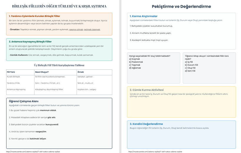 •4. Bölüm: Fiilde Anlam (İş, Oluş, Durum): Yapı konusuna ek olarak, fiillerin anlam özelliklerini pekiştiren karma test ve yaratıcı yazma alanları.