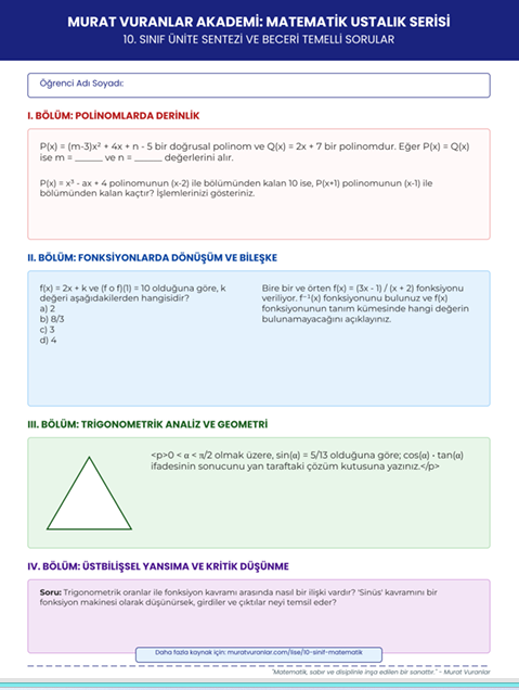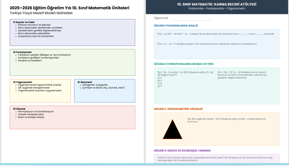 2025–2026 eğitim öğretim yılı 10. Sınıf Matematik dersi, Millî Eğitim Bakanlığı tarafından uygulanan Türkiye Yüzyılı Maarif Modeli doğrultusunda; kavramsal derinlik, matematiksel modelleme ve akıl yürütme becerileri esas alınarak yapılandırılmıştır.