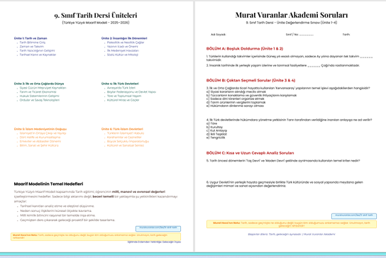 2025–2026 eğitim öğretim yılı 9. Sınıf Tarih dersi, Millî Eğitim Bakanlığı tarafından uygulanan Türkiye Yüzyılı Maarif Modeli doğrultusunda; tarihsel düşünme becerisi, kronolojik okuma, kanıt kullanma ve medeniyet perspektifi temelinde yapılandırılmıştır