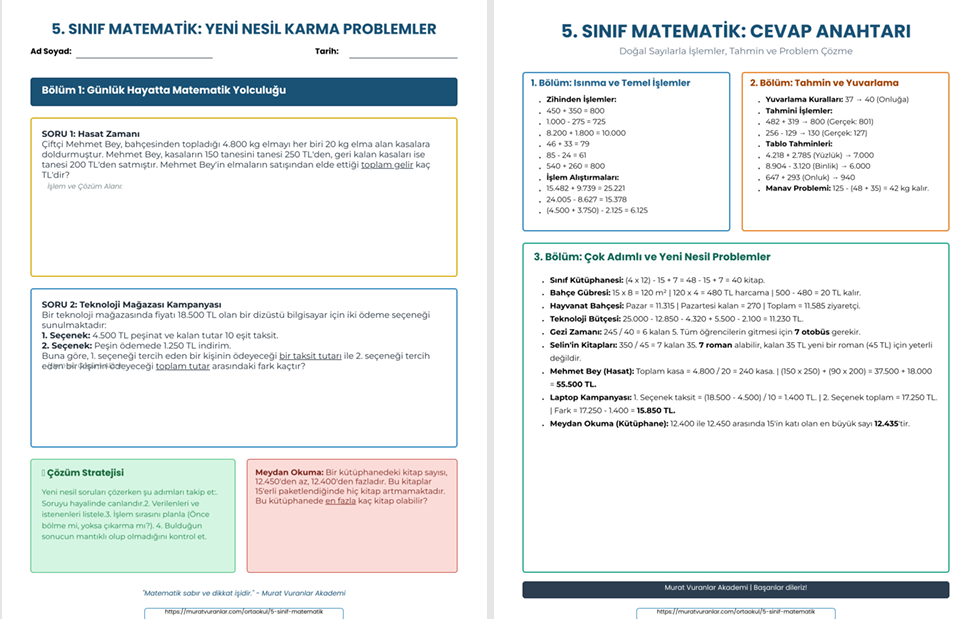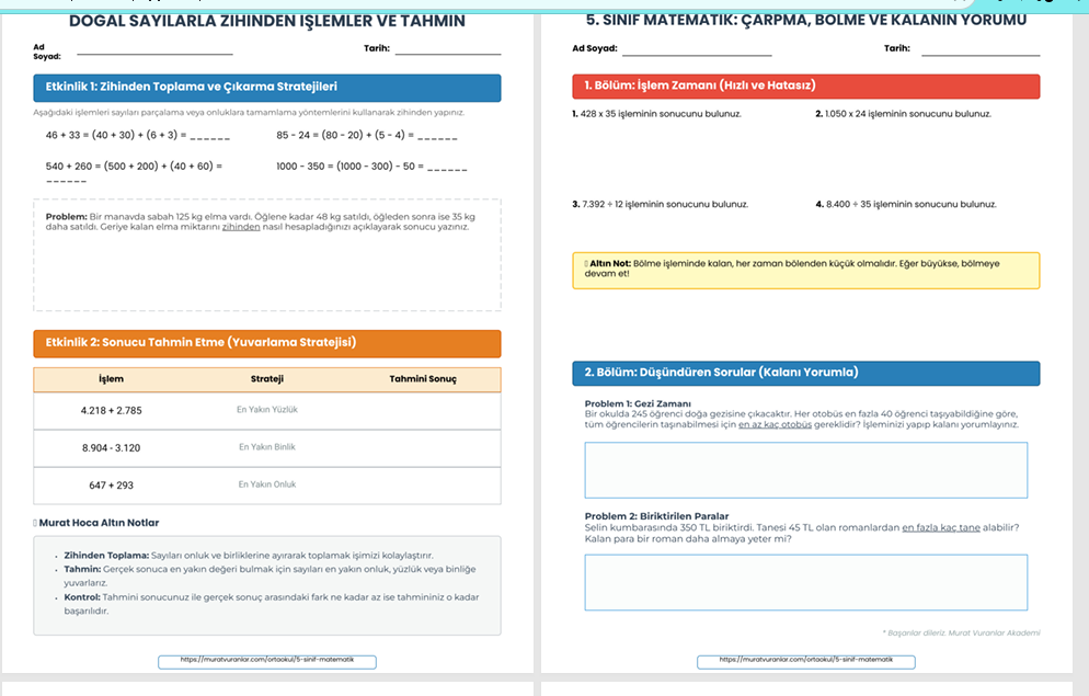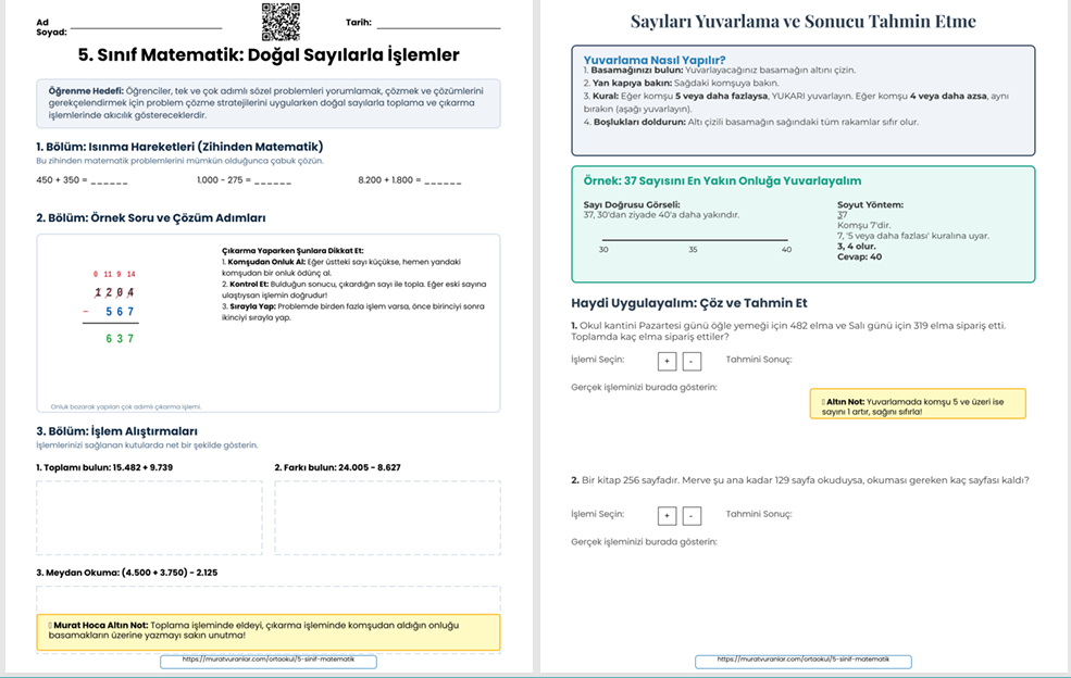 Matematik artık daha anlaşılır! 5. sınıf seviyesine tam uyumlu, bol görselli ve adım adım öğretici 'Doğal Sayılarla İşlemler' çalışma kağıdımız yayında.