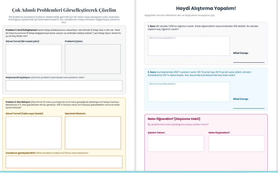 2.Görselleştirme Stratejisi (İkili Kodlama): Problemleri sadece sayılarla değil, şekil ve diyagramlarla çözmeyi öğreten özel "Görsel Temsil" alanları.