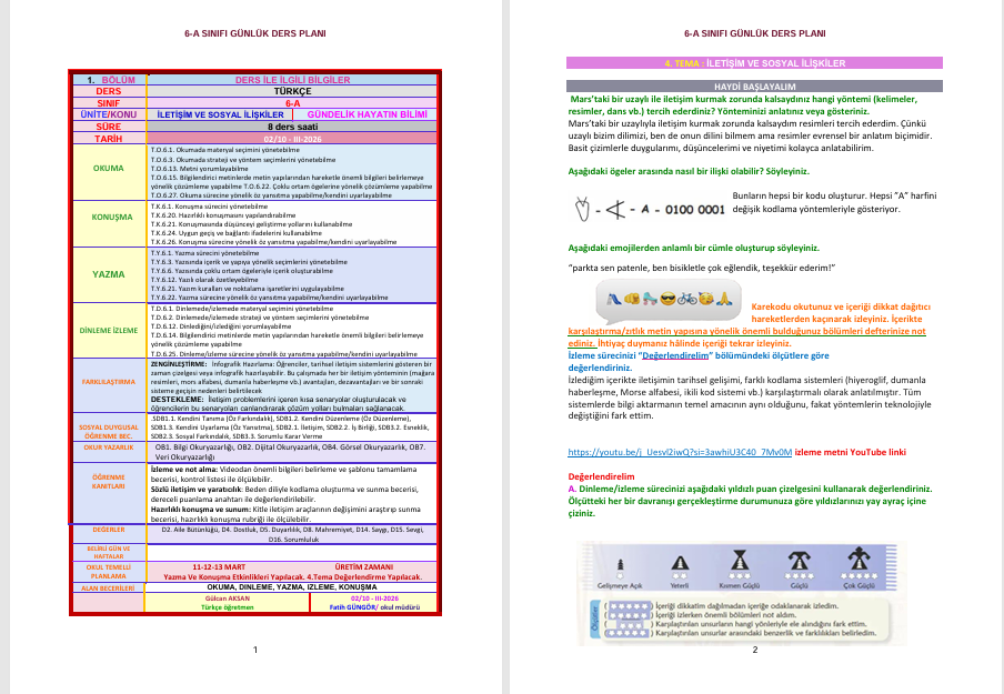6. SINIF TÜRKÇE GÜNLÜK DERS PLANI/ İLETİŞİM VE SOSYAL İLİŞKİLER GÜNDELİK HAYATIN BİLİMİ