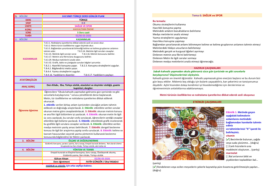 8. SINIF TÜRKÇE GÜNLÜK DERS PLANI/SAĞLIK VE SPOR /KAHVALTININ ÖNEMİ