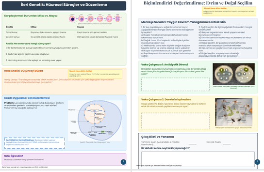 Mitoz ve mayoz bölünmenin detaylı karşılaştırması, senaryo analizleri ve gen düzenlenmesi (Lac operon mekanizması) gibi karmaşık süreçler ele alınır. Ayrıca yaygın yapılan kavram yanılgılarını düzeltmek için "Hata Analizi" bölümü bulunur.