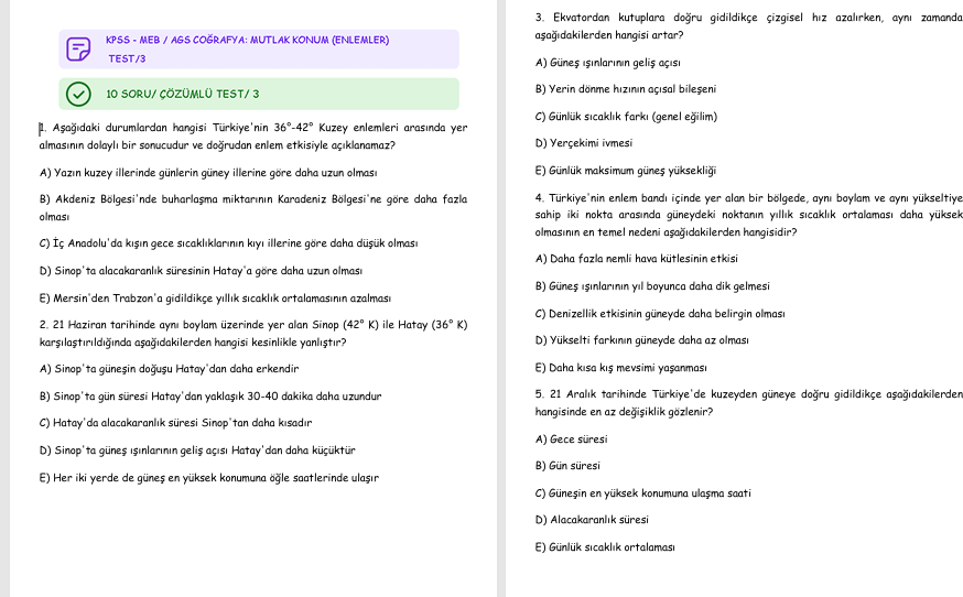KPSS / AGS COĞRAFYA: MUTLAK KONUM (ENLEMLER) TEST/3