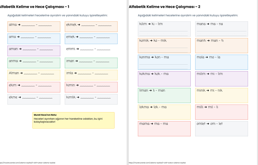 •Okuma Metinleri: Öğrenilen harfleri pekiştiren, kısa ve anlaşılır okuma parçaları.