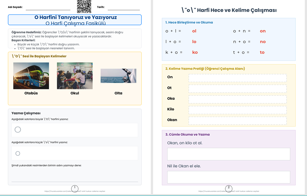 Bu çalışma fasikülü, 1. sınıf öğrencilerinin "O" harfini tanıması, okuması ve yazması için hazırlanmış kapsamlı bir settir. Toplam 21 sayfadan oluşan bu içerik, basitten karmaşığa doğru şu etkinlikleri içermektedir: