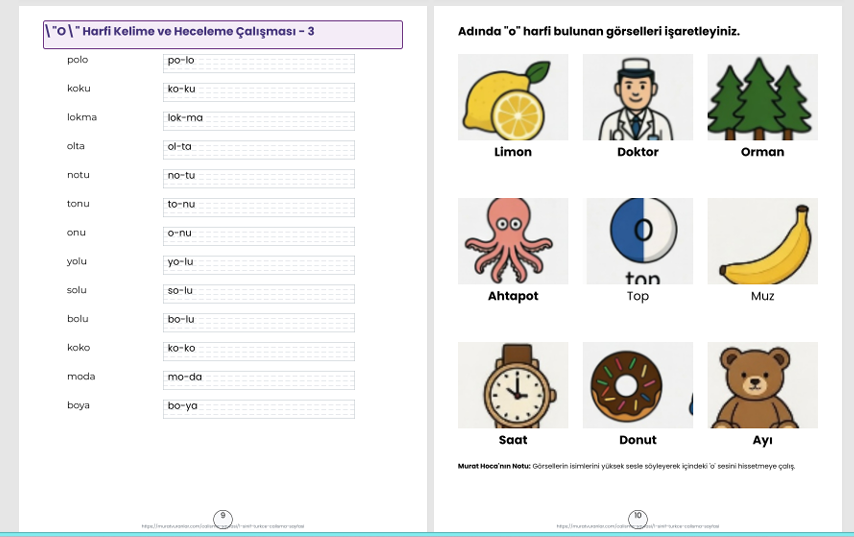 •Görsel Eşleştirme: İsmi "O" harfiyle başlayan veya içinde "O" harfi geçen nesneleri bulma oyunları.