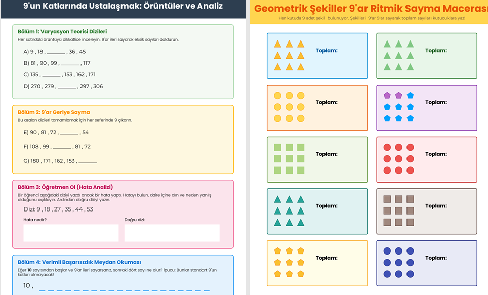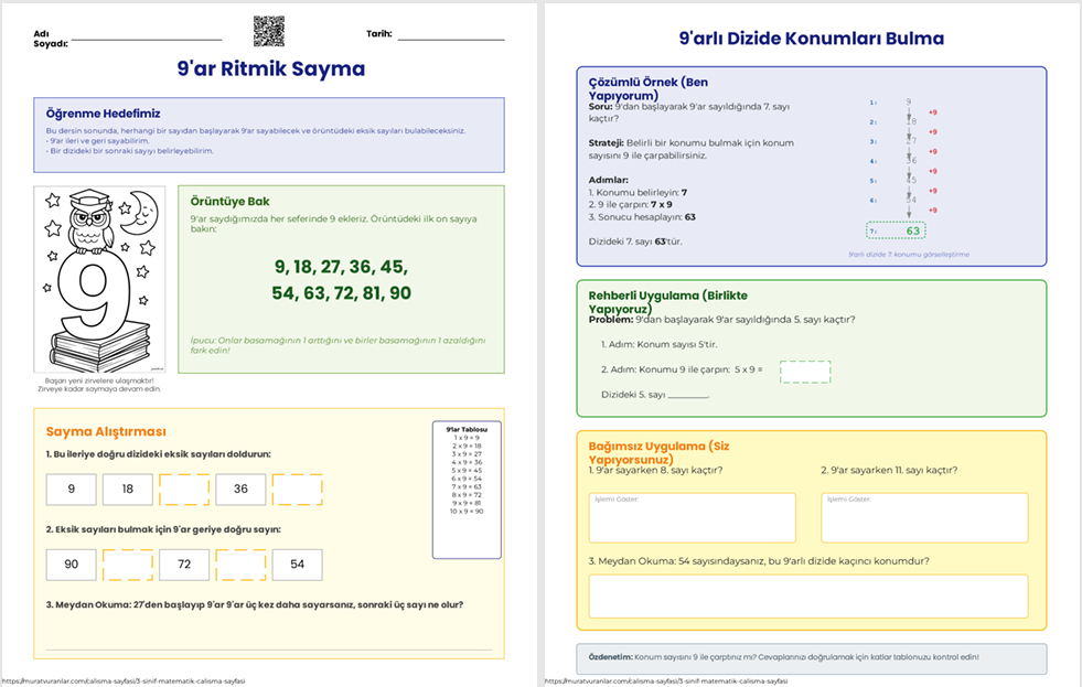 3. Sınıf Matematik: 9'ar Ritmik Sayma ve Örüntüler Çalışma Seti