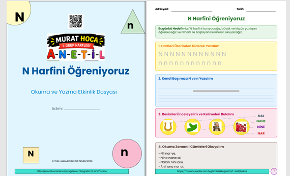 "Öğrencilerinizin 'N' sesini en eğlenceli ve kalıcı şekilde öğrenmeleri için hazırlanan bu 17 sayfalık kapsamlı fasikül; harf sezdirme, büyük-küçük harf yazma çalışmaları, interaktif hece birleştirme tabloları, zengin kelime havuzları ve özgün okuma metinlerini içerir. Murat Vuranlar tarafından pedagojik kriterlere uygun olarak hazırlanan bu materyal, hem sınıf içi uygulamalar hem de ev ödevleri için mükemmel bir yardımcıdır."