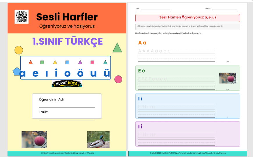 *muratvuranlar.com, ilkokul öğrencilerinin okuma-yazma yolculuğunu keyifli ve kalıcı hale getiren, öğretmenler ve veliler için özel olarak tasarlanmış bir eğitim platformudur. 1. sınıf Türkçe müfredatıyla tam uyumlu; sesli harf çalışmaları, interaktif okuma etkinlikleri ve özgün çalışma kağıtlarımızla çocukların akademik gelişimini destekliyoruz. Uzman bakış açısıyla hazırlanan kaliteli eğitim içeriklerine ulaşmak, öğrenme sürecini kolaylaştırmak ve sınıf içi verimliliği artırmak için doğru adre