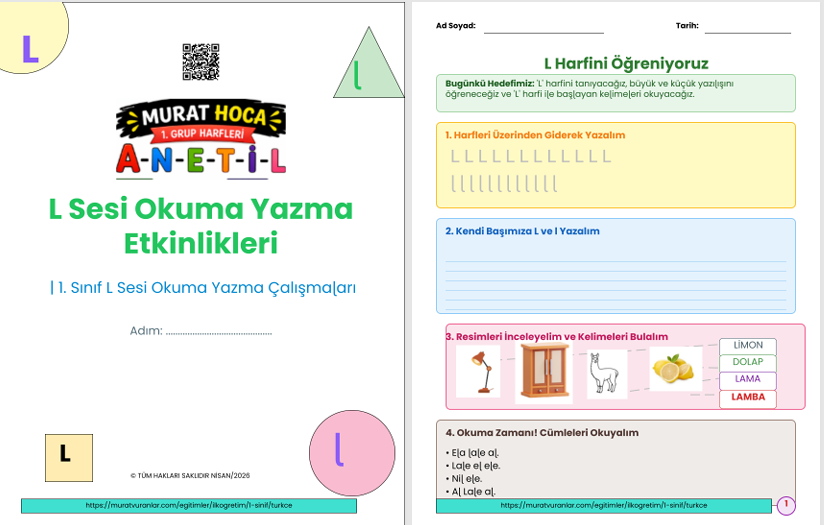 İlkokul 1. sınıf öğrencilerinin okuma-yazma yolculuğundaki en önemli duraklardan biri olan 'L' sesi için özel olarak hazırlanan bu 24 sayfalık dev fasikül, Murat Vuranlar kalitesiyle sizlerle! Öğrencilerimizin harfi tanıması, doğru yazması ve kelime/cümle mantığını kavraması için titizlikle tasarlanan bu setin içerisinde: Harf Yazma Çalışmaları: Büyük ve küçük 'L' harfi üzerinden gitme ve serbest yazma alanları. Görsel-Kelime Eşleştirme: Kelime dağarcığını geliştiren resimli etkinlikler.