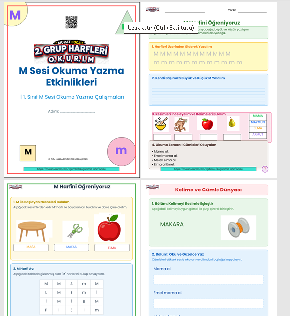 Bu kapsamlı eğitim materyali, 1. sınıf öğrencilerinin "M" sesini en eğlenceli ve kalıcı şekilde öğrenmesi için tasarlanmıştır. İçerisinde harf yazma çalışmaları, hece birleştirme tabloları, okuma piramitleri, kelime-resim eşleştirme oyunları ve okuma metinleri gibi zengin etkinlikler yer almaktadır. Öğrencilerin okuma-yazma becerilerini pekiştirirken öğrenme sürecini keyifli hale getiren bu dijital kaynağı hemen kullanmaya başlayabilirsiniz.