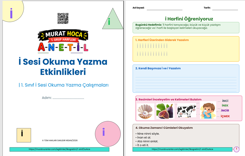 "İ" sesini öğrenirken çocukların sıkılmayacağı harika bir içerik! İnek, incir ve iğne gibi görsel destekli kelime çalışmaları, hece birleştirme oyunları ve dikte etkinlikleri ile dolu 20 sayfalık eğitim materyalimize hemen göz atın. Murat Hoca ile ilkokuma yazma öğretimi artık çok kolay.