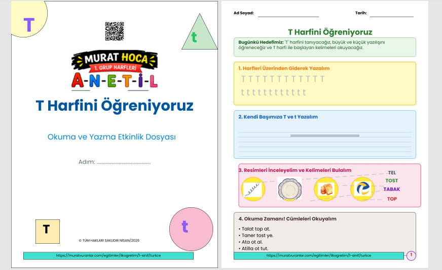 1. sınıf "T" sesi öğretimi için özel olarak hazırlanmış; harf tanıma, hece birleştirme, kelime oluşturma ve okuma metinlerini içeren, çocukların eğlenerek öğreneceği en kapsamlı eğitim materyalleri muratvuranlar.com'da!