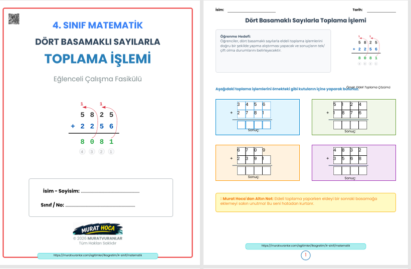 4. sınıf matematik dersi "Toplama İşlemi" ünitesi için hazırlanmış özgün çalışma fasikülü. Dört basamaklı sayılarla eldeli toplama, zihinden toplama yöntemleri ve yeni nesil problemlerle matematiği eğlenerek öğrenin.