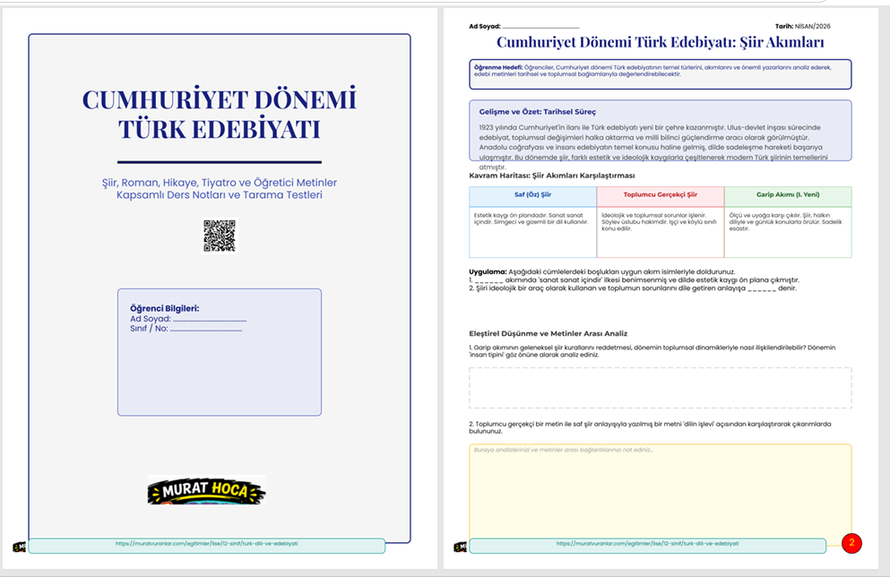 Bu kaynakta neler var? Şiir Akımları: Saf Şiir'den İkinci Yeni'ye, Toplumcu Gerçekçilikten Mistik Duyarlılığa kadar tüm şematik karşılaştırmalar. Roman ve Hikaye: 1923'ten günümüze; Köy Edebiyatı, Modernizm, Postmodernizm ve 'Üç Kemaller' analizi. Tiyatro ve Öğretici Metinler: Epik tiyatronun incelikleri, Haldun Taner ve Nurullah Ataç gibi ustaların üslup incelemeleri. İnteraktif Uygulamalar: Boşluk doldurma, karakter tahlil tabloları ve eleştirel düşünme soruları.