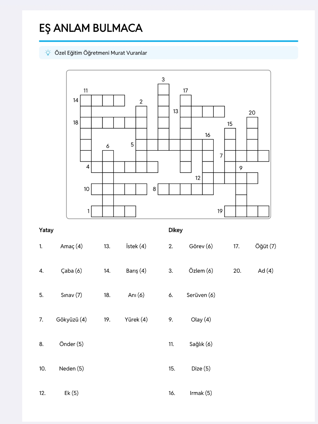 BULMACA/ EŞ ANLAM/ KUTUCUKLARA UYGUN KELİMEYİ YAZ