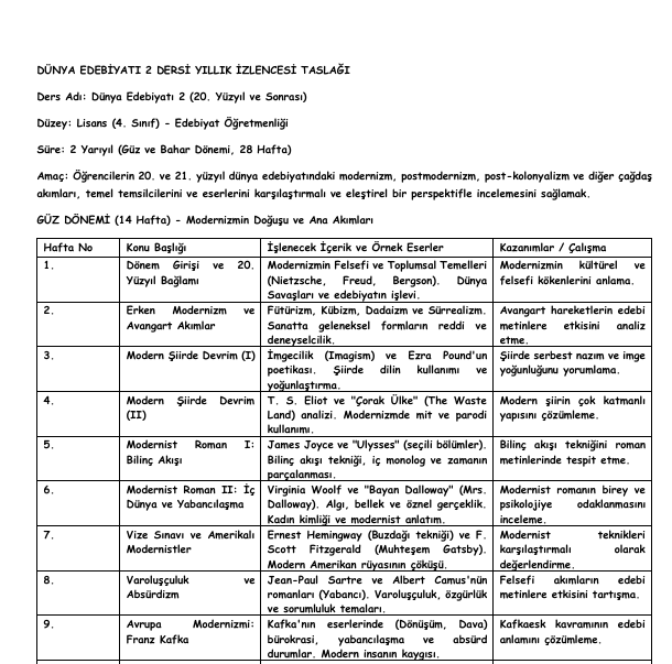 DÜNYA EDEBİYATI 2 DERSİ YILLIK İZLENCESİ