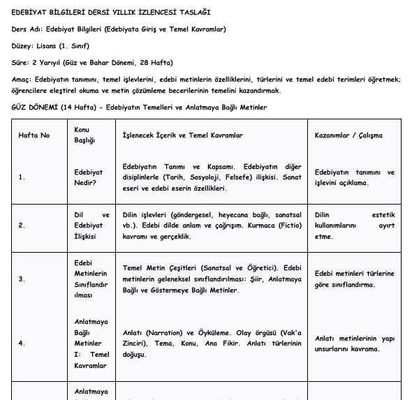 EDEBİYAT BİLGİLERİ DERSİ YILLIK İZLENCESİ