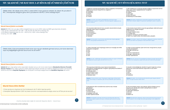 AYT'de sıkça karşılaşılan kan grupları ve ekolojik niş/rekabet gibi konularda, Murat Hoca’nın adım adım çözüm stratejileri ve analiz notları yer alır.